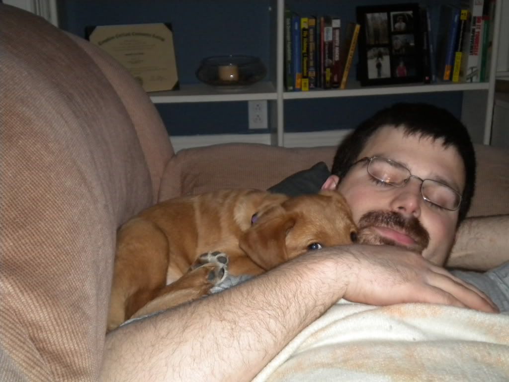 well Maggie is growing still, 50 lbs at her last weigh in at the vet and that was about a month ago. Why were we at the vet you ask? well we came home from work and when I went to pet the fur ball i noticed her eye was all red and goopey (it was REALLY gross) My first thought was that one of the cats finally caught her in the eye and she has a tear in it or something. I called the vet and they got me in that night. After some cookies and a very quick veterinarian with come green eye drops it was confirmed that there was no injury to the eye, but she had conjunctivitis....pink eye! A week of drops and she's cured. Her eye still looks red, but they are getting kind of droopy, so I think that is just the way they are going to be.